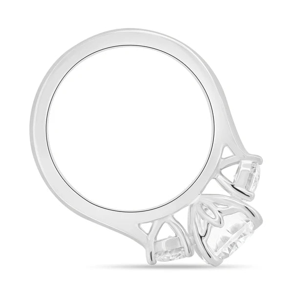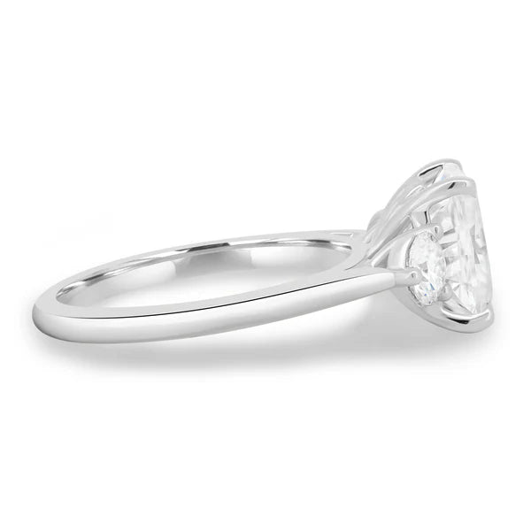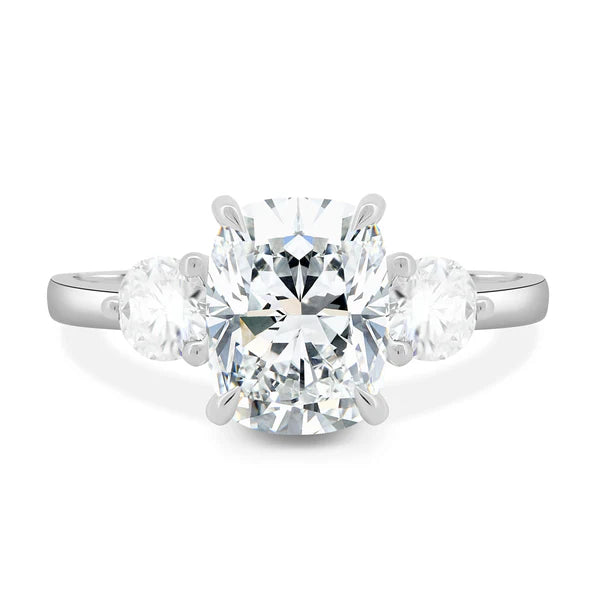 An elegant 4 claw elongated cushion trilogy. Set in a stunning cathedral design with 2 round cut side stones.