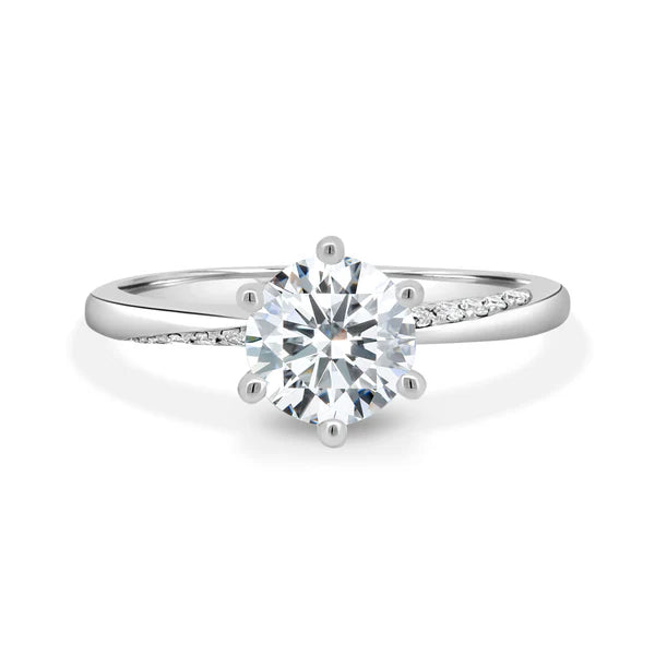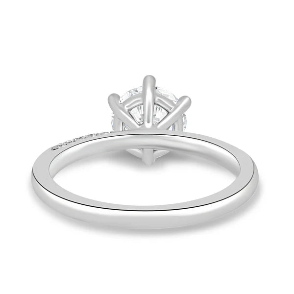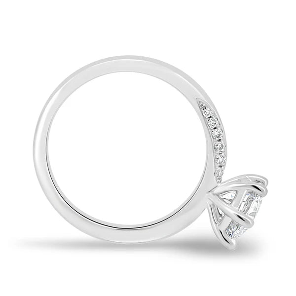 Micro pave band and delicate round claws add a touch of glamour to her classic round solitaire design.