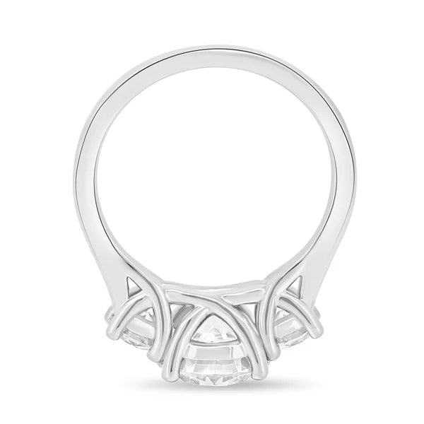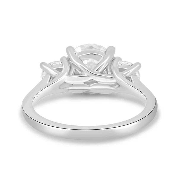 Pictured here with an impressive round cut centre stone and two beautiful round cut side stones