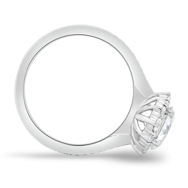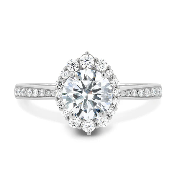 Displayed here with a round cut stone, Jessica is framed by a gorgeous halo and completed with an elegant half pavé tapered band.